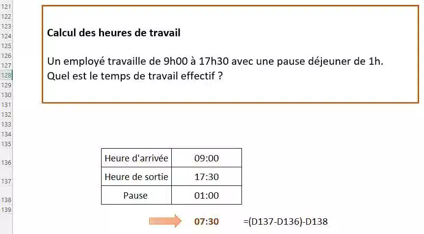 Il est indispensable d'appliquer un format de cellule approprié pour que les calculs d'heures soient justes.