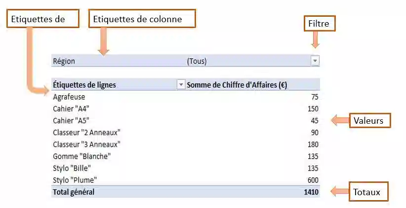 Exemples : "Produit", "Région", "Ville", "Catégorie de produit", "Date" (regroupée par mois, trimestre, année), "Nom du client", "Sexe".