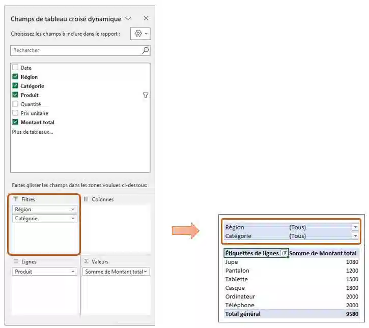 Inconvénient de la méthode : Lorsque vous appliquez des filtres de rapport à TCD, vous pouvez parfois sélectionner plusieurs éléments pour un même filtre. Cependant, Excel ne fournit pas d'indication claire de tous les éléments sélectionnés.